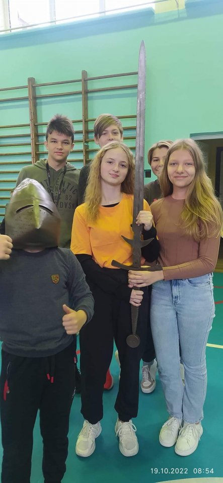 19 października 2022 r. w naszej szkole Grupa Artystyczna Rekonstrukto zaprezentowała pokaz historyczny „Życie i kultura w średniowieczu”. Program był przeznaczony dla uczniów klas 0-VIII i obejmował: prezentację obyczajów i kultury średniowiecza, przegląd ekwipunku i uzbrojenia, zapierające dech w piersiach pojedynki, prawo dawne, gry i zabawy plebejskie, dużą kolekcję broni i rekwizytów oraz możliwość osobistego zapoznania się z rekwizytami i strojem. Ogromne zainteresowanie wśród uczniów wzbudziła żywa lekcja historii, szczególnie zakucie jednego z ósmoklasistów w dyby i próba ciężkiego miecza, w czasie której wybrani uczniowie mogli spróbować swoich sił, trzymając w jednej ręce miecz w pozycji poziomej. Okazało się, że to niezwykle trudne zadanie. Na zakończenie pokazu można było dokładnie obejrzeć elementy uzbrojenia, broń, narzędzia tortur używane w średniowieczu.