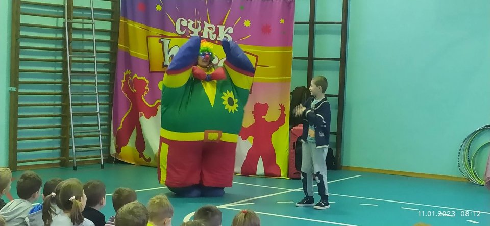 Dnia 11 stycznia 2023 roku naszą szkołę odwiedziła grupa cyrkowa „Heca”. Widzowie mogli podziwiać zabawnego klowna, żonglowanie piłeczkami, akrobacje na drabinie, jeżdżenie na cyrkowych rowerach, hula-hop oraz sztukę iluzji. Co ciekawe w pokazach brali udział uczniowie, którzy próbowali swych sił w zawodzie cyrkowca. Wiele emocji wzbudził wyczarowany w cylindrze szczurek i oczywiście ogromny wąż, którego można było dotknąć. Na pamiątkę wizyty grupy „Heca” uczniowie zakupili zabawne nosy klowna, świecące opaski lub trąbki.