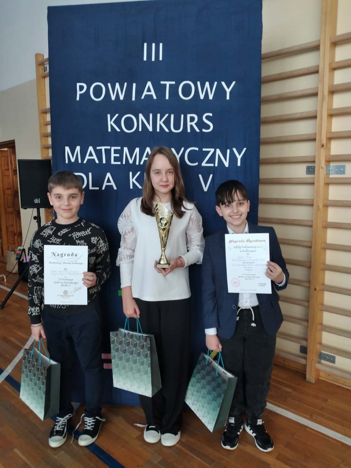 12 marca uczniowie z klasy trzeciej ( Filip Dobrodziej, Rozalia Wąsik, Jakub Więcławski, Lena Zagajewska) godnie reprezentowali naszą szkołę w XXI edycji powiatowego konkursu "Mistrz Matematyki" organizowanym przez SP nr 4 z oddziałami integracyjnymi w Sochaczewie. Chociaż tym razem nie udało nam się stanąć na podium, nie poddajemy się spróbujemy swoich sił już jako 5-klasiści. Gratulujemy wszystkim uczestnikom konkursu. Dla nas i tak jesteście Mistrzami